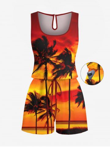 Plus Size Coconut Tree Ombre Sky Print Cinched Hawaii Romper - Dark Orange - Xs