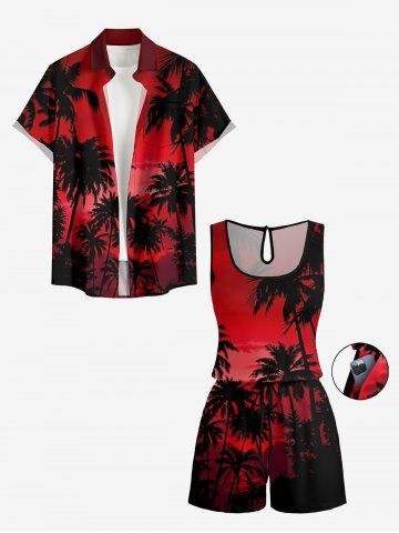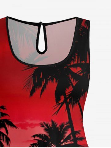 Plus Size Coconut Tree Ombre Sky Print Hawaii Drawstring Pocket Romper - Red - Xs