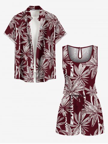 Plus Size Coconut Tree Print Hawaii Drawstring Pocket Romper - Red Wine - S