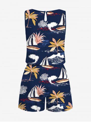 Plus Size Coconut Tree Sailboat Print Hawaii Drawstring Pocket Romper - Deep Blue - Xs