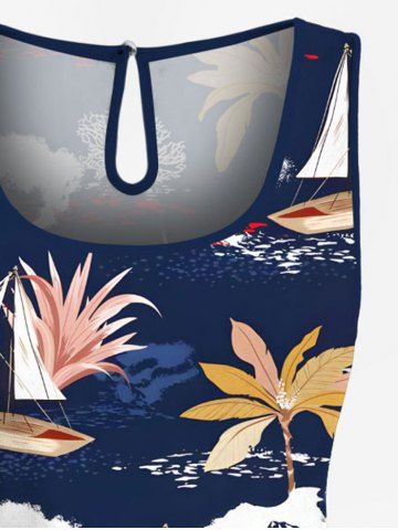 Plus Size Coconut Tree Sailboat Print Hawaii Drawstring Pocket Romper - Deep Blue - 5x