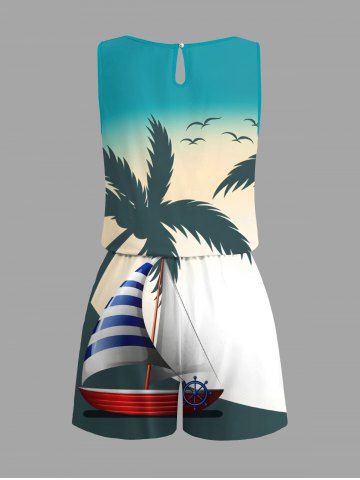 Plus Size Coconut Tree Sailboat Rudder Ombre Print Cinched Hawaii Romper - Green - 3x