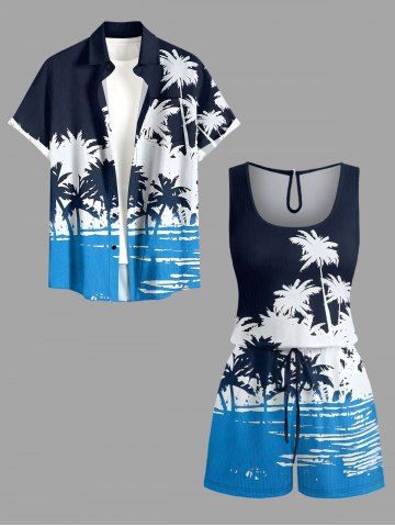 Plus Size Coconut Tree Sea Colorblock Print Cinched Hawaii Romper - Navy Blue - 4x