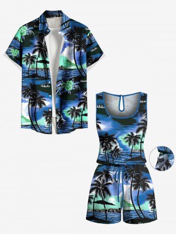Plus Size Coconut Tree Sea Flower Print Hawaii Drawstring Pocket Romper - Blue - Xxs