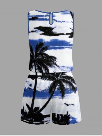 Plus Size Coconut Tree Sea Print Hawaii Drawstring Pocket Romper - Blue - 1x