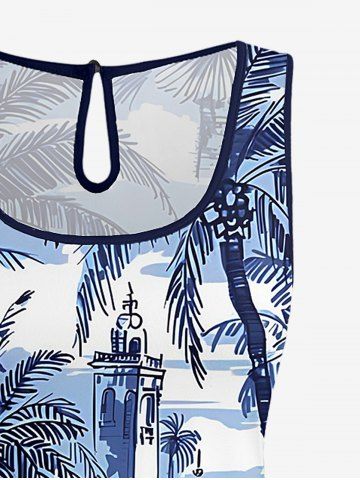 Graphic Pants > Plus Size Coconut Tree Seascape Building Print Hawaii Drawstring Pocket Romper