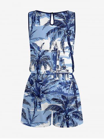 Plus Size Coconut Tree Seascape Building Print Hawaii Drawstring Pocket Romper - Sky Blue - 1x
