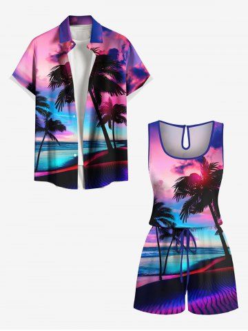 Plus Size Coconut Tree Seascape Cloud Print Cinched Hawaii Romper - Purple - S