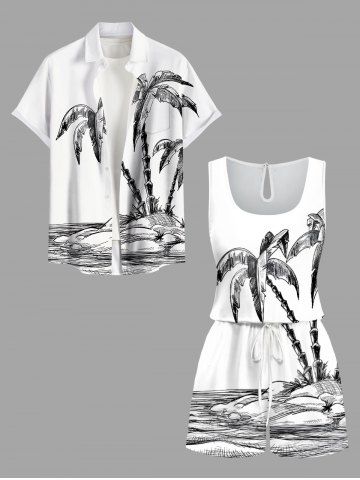 Graphic Pants > Plus Size Coconut Tree Seascape Print Cinched Hawaii Romper