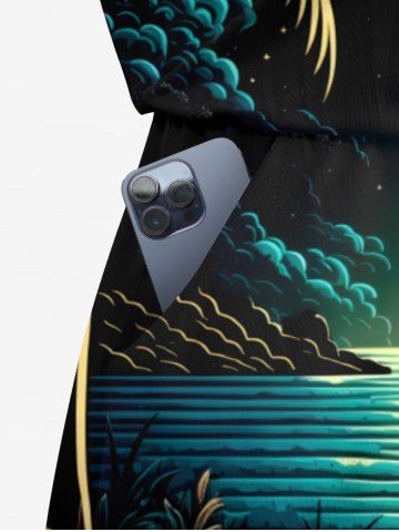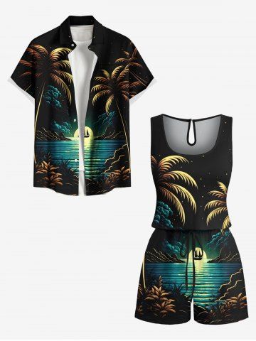 Plus Size Coconut Tree Sun Boat Seascape Print Cinched Hawaii Romper - Black - 5x