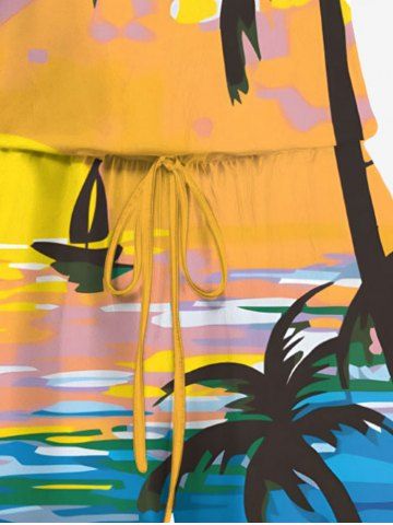 Plus Size Coconut Tree Sun Cloud Seascape Print Cinched Hawaii Romper - Yellow - S