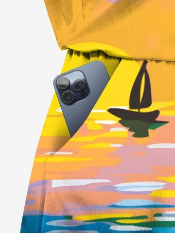 Plus Size Coconut Tree Sun Cloud Seascape Print Cinched Hawaii Romper - Yellow - 6x