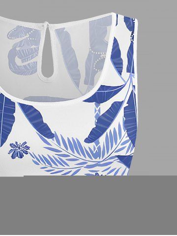Plus Size Coconut Tree Tropical Leaf Blue and White Porcelain Style Print Hawaii Drawstring Pocket Romper - Blue - Xs
