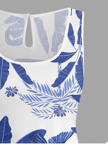 Plus Size Coconut Tree Tropical Leaf Blue and White Porcelain Style Print Hawaii Drawstring Pocket Romper - Blue - M