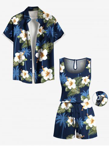 Graphic Pants > Plus Size Coconut Tree Tropical Leaf Hibiscus Flower Print Hawaii Drawstring Pocket Romper