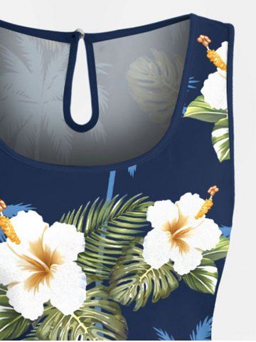Plus Size Coconut Tree Tropical Leaf Hibiscus Flower Print Hawaii Drawstring Pocket Romper - Black - 4x