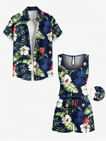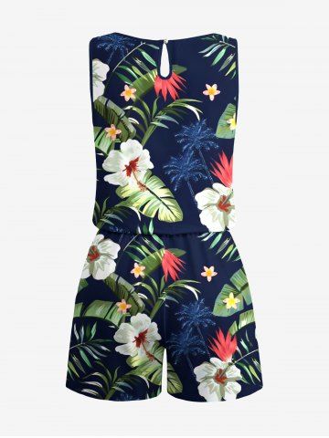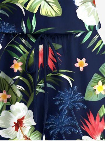 Plus Size Coconut Tree Tropical Leaf Hibiscus Flower Printe Hawaii Drawstring Pocket Romper - Deep Blue - S
