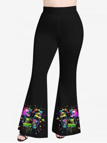 Plus Size Colorful Skull Skeleton Heart Painting Splatter Print Flare Pants - Black - S