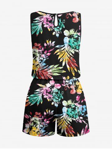 Plus Size Colorful Tropical Leaf Flower Print Hawaii Drawstring Pocket Romper - Black - 6x