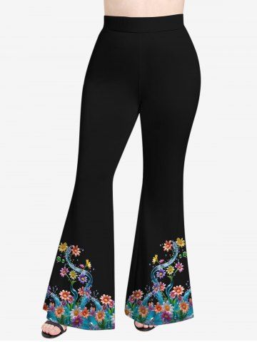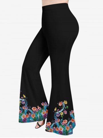 Plus Size Daisy Flower Water Print Flare Pants - Black - 4x