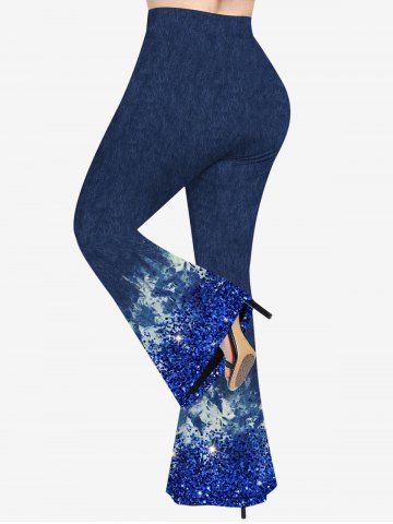 Plus Size Denim Tie Dye Sparkling Sequin Glitter 3D Print Flare Disco Pants - Blue - M