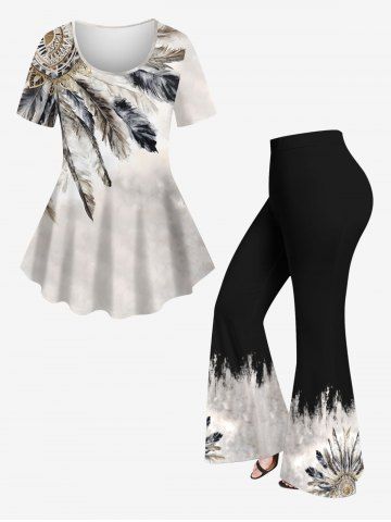 Plus Size Ethnic Feather Clock Tie Dye Print Flare Pants - Black - 2x