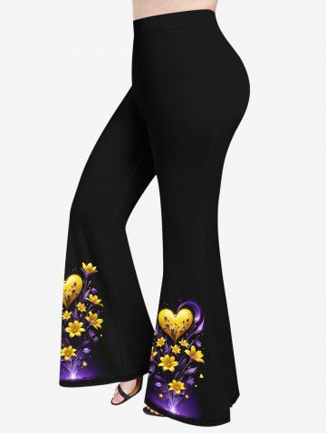 Plus Size Fireworks Flower Leaf Heart Glitter 3D Print Flare Pants - Black - S