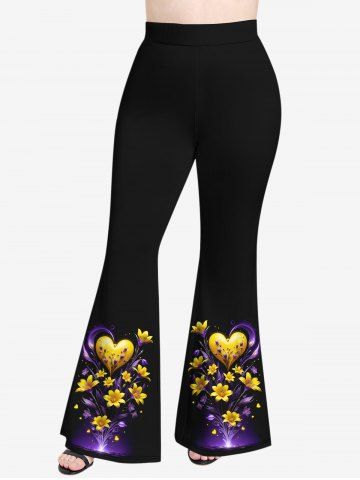 Plus Size Fireworks Flower Leaf Heart Glitter 3D Print Flare Pants - Black - 2x