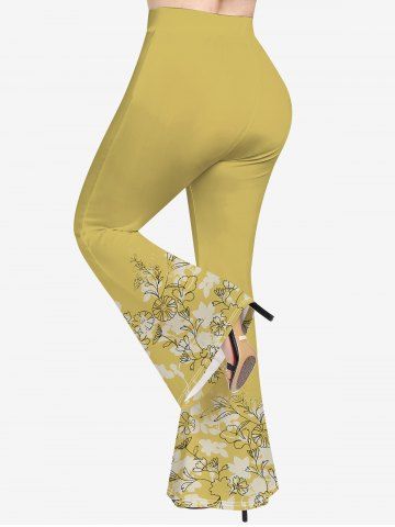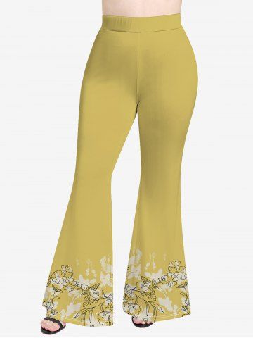 Plus Size Floral Leaf Colorblock Print Pull On Flare Pants - Deep Yellow - 6x