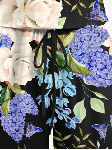 Plus Size Flower Leaf Branch Butterfly Print Hawaii Drawstring Pocket Romper - Black - L