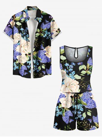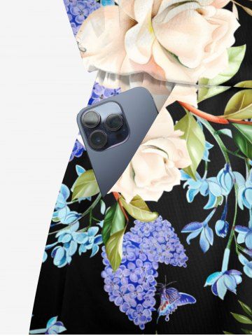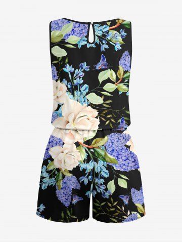 Plus Size Flower Leaf Branch Butterfly Print Hawaii Drawstring Pocket Romper - Black - 6x