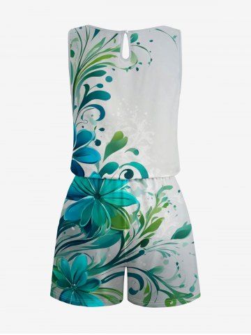 Plus Size Flower Leaf Branch Print Hawaii Drawstring Pocket Romper - Green - Xxs