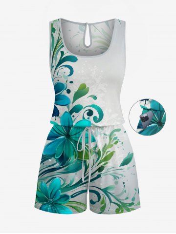 Graphic Pants > Plus Size Flower Leaf Branch Print Hawaii Drawstring Pocket Romper
