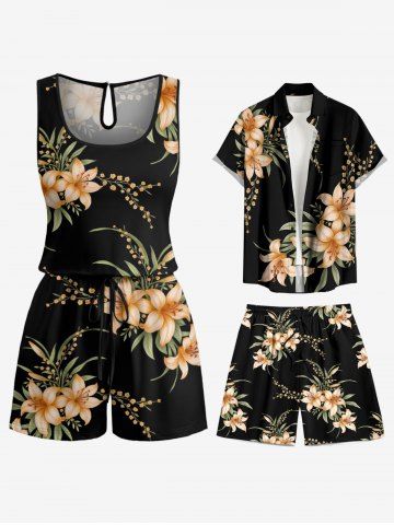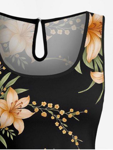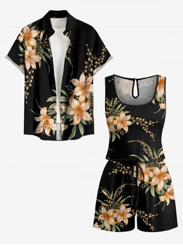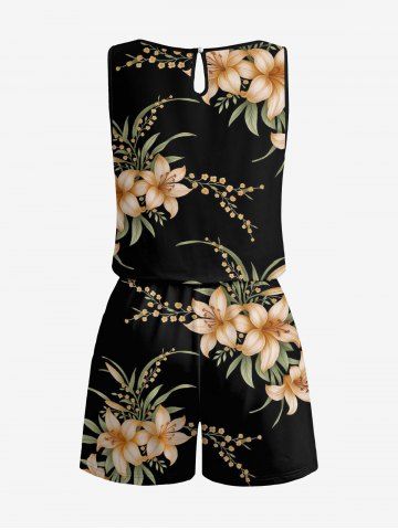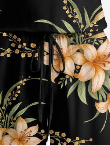 Plus Size Flower Leaf Branch Print Hawaii Drawstring Pocket Romper - Black - 6x