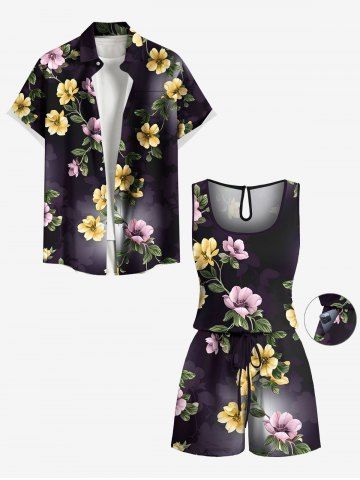 Plus Size Flower Leaf Branch Print Hawaii Ombre Drawstring Pocket Romper - Black - 2x