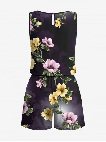 Plus Size Flower Leaf Branch Print Hawaii Ombre Drawstring Pocket Romper - Black - 5x