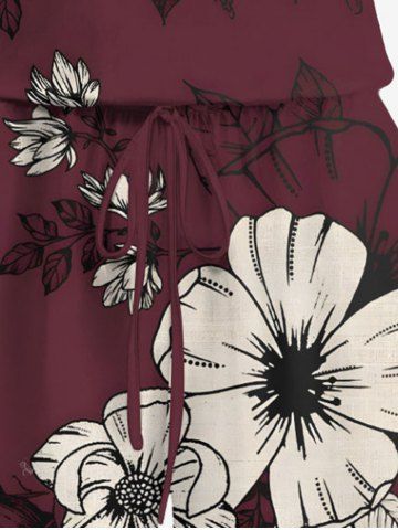 Plus Size Flower Leaf Branch Print Hawaii Ombre Drawstring Pocket Romper - Red Wine - M