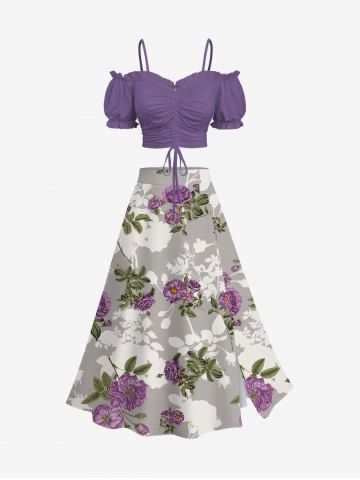 Plus Size Flower Leaf Branch Print Hawaii Split A Line Skirt - Light Gray - 1x