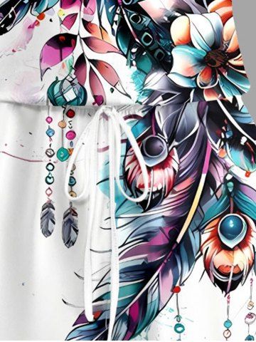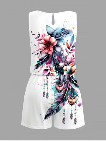 Plus Size Flower Leaf Feather Print Hawaii Drawstring Pocket Romper - White - Xs
