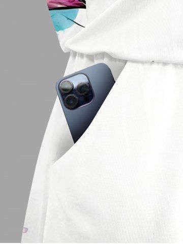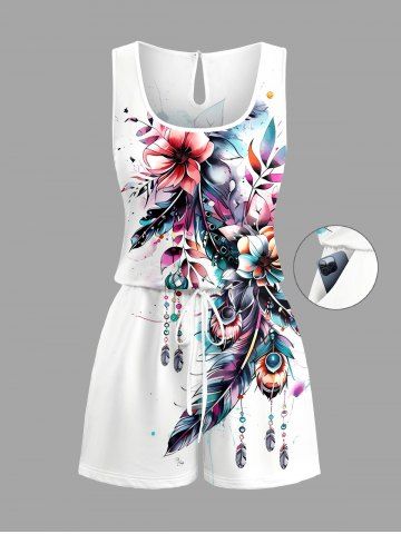 Plus Size Flower Leaf Feather Print Hawaii Drawstring Pocket Romper - White - 1x