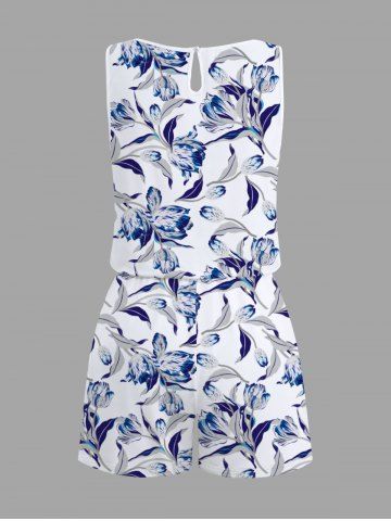 Plus Size Flowers Leaf Print Cinched Hawaii Romper - White - Xs