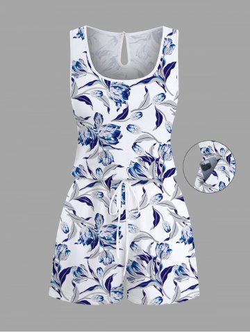 Plus Size Flowers Leaf Print Cinched Hawaii Romper - White - 2x