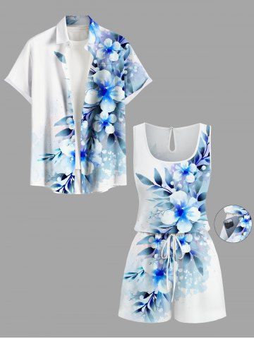 Plus Size Flowers Leaf Print Cinched Hawaii Romper - White - M