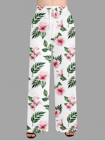 Plus Size Flowers Leaf Print Drawstring Hawaii Wide Leg Pants - White - 3x