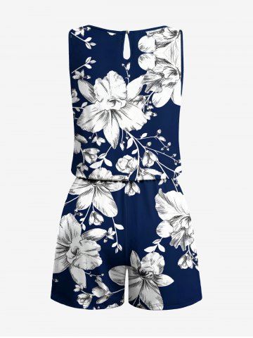 Plus Size Flowers Leaf Tropical Print Cinched Hawaii Romper - Blue - 2x