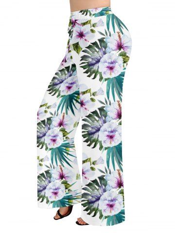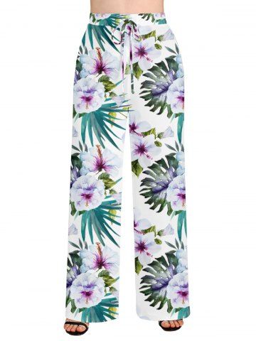 Plus Size Flowers Leaf Tropical Print Drawstring Hawaii Wide Leg Pants - White - S