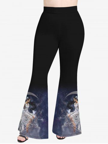 Renaissance Plus Size Galaxy Moon Wings Cat Angel Print Flare Pants - Black - 1x