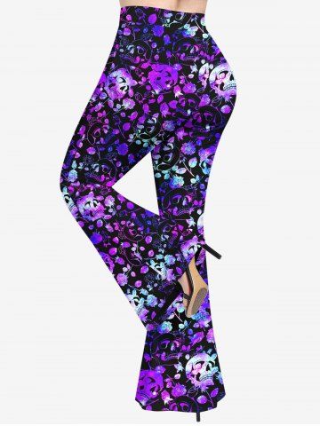 Plus Size Glitter Colorful Skulls Rose Flower Leaf Print Ombre Pull On Flare Pants - Purple - 2x