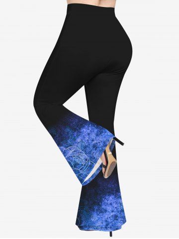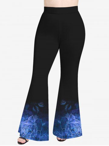 Plus Size Glitter Ombre Rose Flower Print Pull On Flare Pants - Blue - 3x