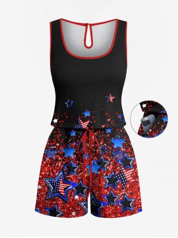 Plus Size Glitter Sequins Patriotic American Flag Print Drawstring Pocket Romper - Black - L